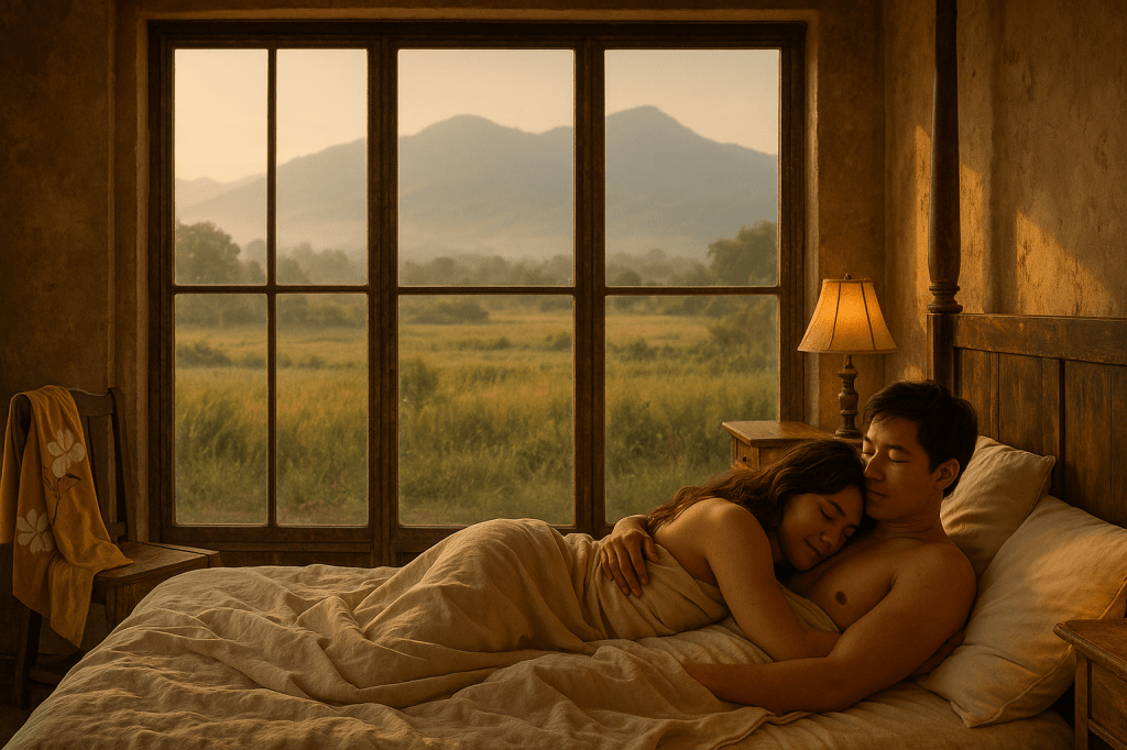He stirred before she did, his eyes opening to the familiar ceiling beams, the flutter of the sheer curtain in the morning breeze. For a moment, he simply breathed, listening to the steady rhythm of her breath where she lay tucked against him. One arm was under her shoulders, the other draped across her back, his hand resting over the curve of her waist as if it had always belonged there.