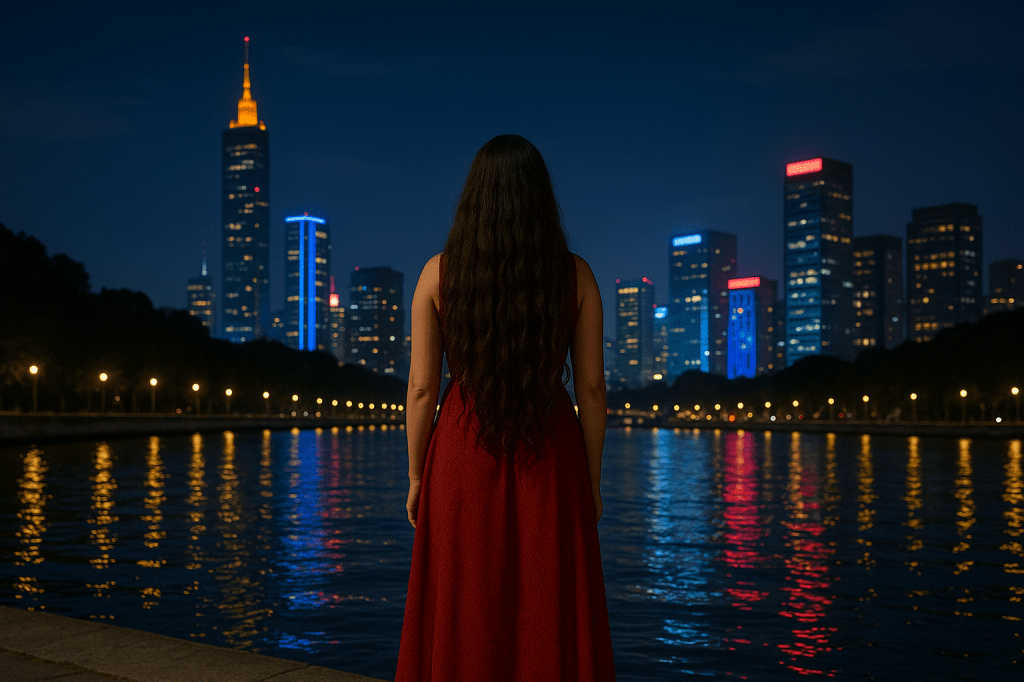The river behind her. The city in front. Neon, chrome, life. Her hotel sat somewhere among those glittering buildings, glowing against the dusk. She was a solo traveller. She had wandered through Europe’s narrow alleys, Japan’s quiet temples, Korea’s bustling streets. She had marvelled. Absorbed. Disappeared into each country like smoke.